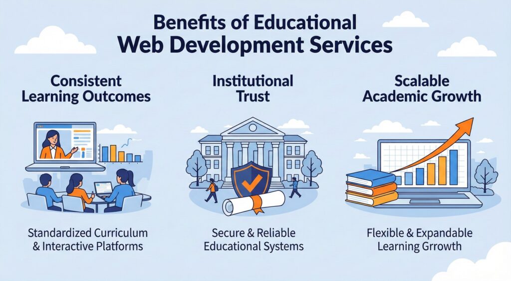 Together, these benefits show how educational web development services create platforms that align academic purpose with long-term institutional stability.